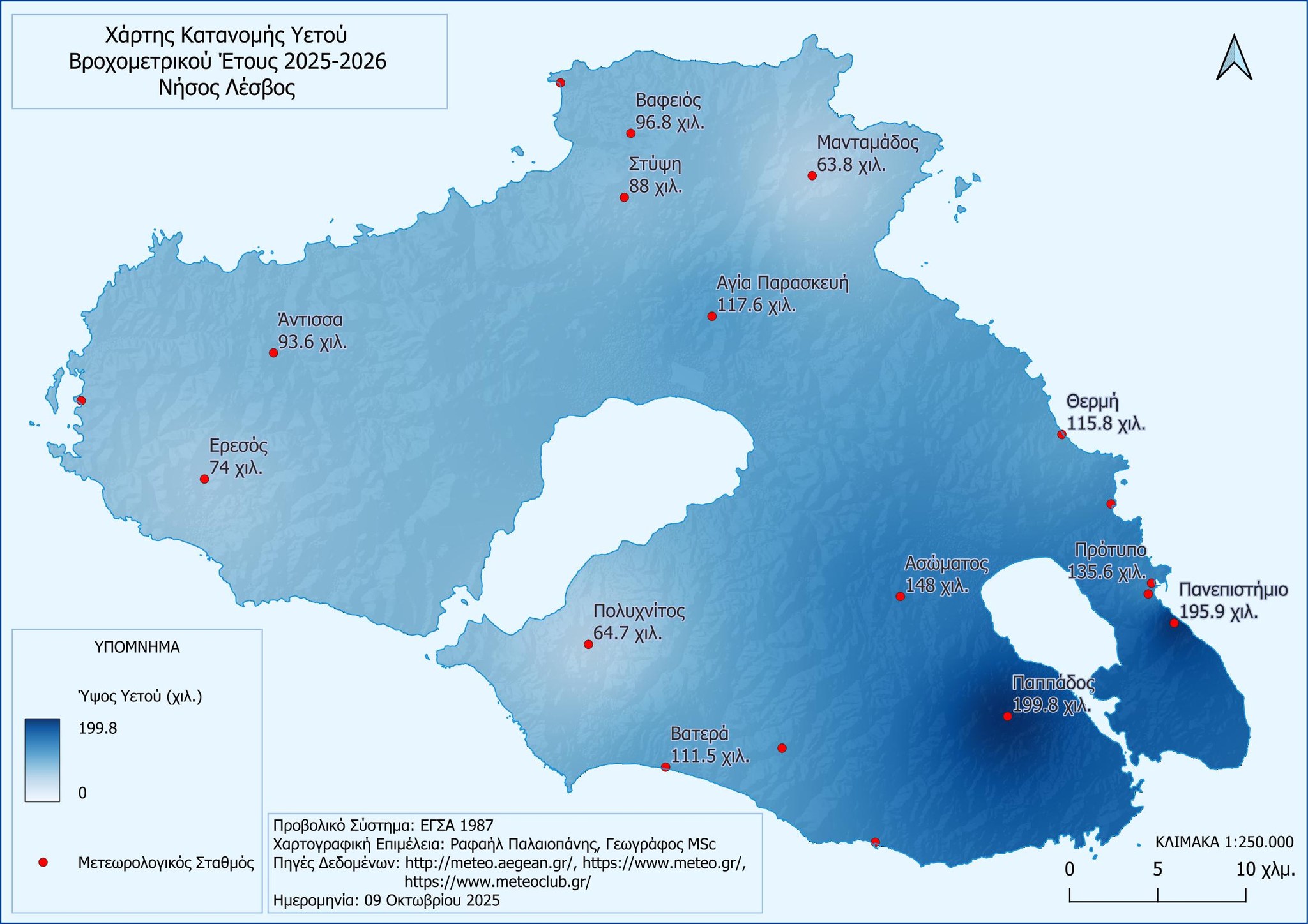 Σύμφωνα τα στοιχεία που συγκέντρωσε ο Ραφαήλ Παλαιοπάνης, Πτυχιούχος Γεωγράφος, ΜSc και καταγράφονται στον χάρτη που ακολουθεί το μεγαλύτερο ύψος βροχής με 199,8 χιλ. κατέγραψε ο Μετεωρολογικός σταθμός του Παπάδου για να ακολουθήσουν του Πανεπιστημίου Αιγαίου με 195,5 χιλ, του Πρότυπου στο Κέντρο της Μυτιλήνης με 135,6 χιλ., του Ασώματου με 148 χιλ, της Θερμής με 115,8 και των Βατερών με 111,5 χιλ.