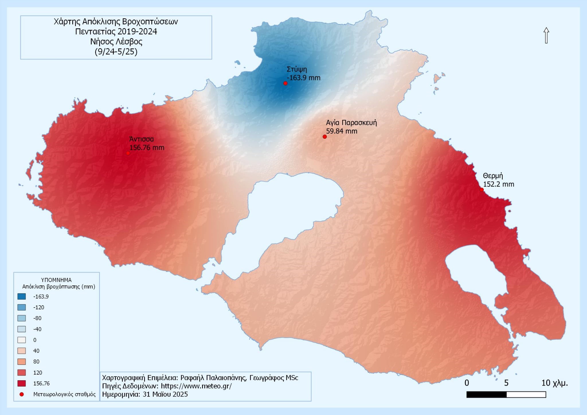 Στο χάρτη που ακολουθεί μπορούμε να δούμε και τις αποκλίσεις των βροχοπτώσεων την πενταετία 2019 -2024.