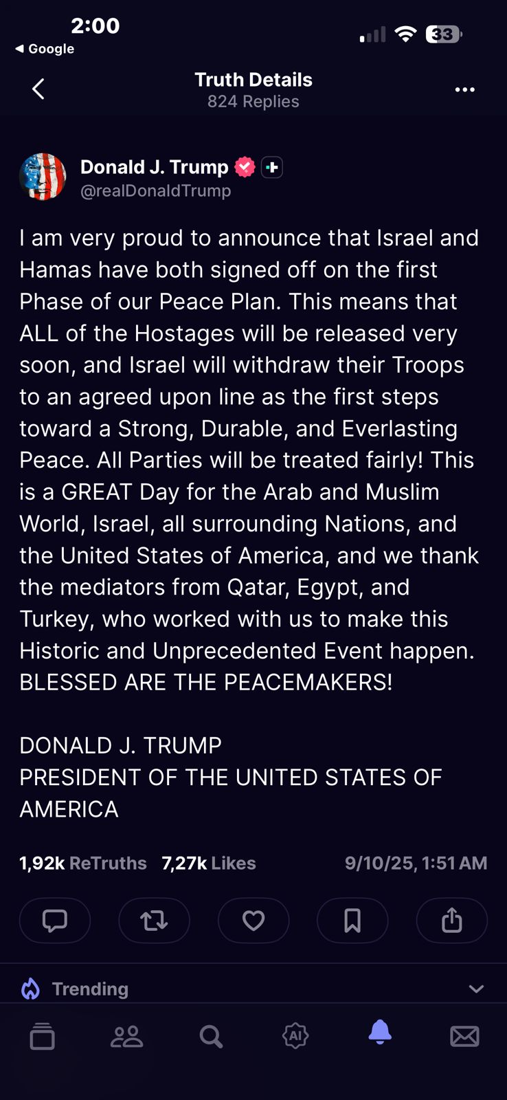 Μετά από λίγη ώρα ο πρόεδρος των ΗΠΑ Ντόναλντ Τραμπ με ανακοίνωσή του επιβεβαίωσε όχι μόνο την συμφωνία αλλά την υπογραφή της πρώτης φάσης του σχεδίου του για την ειρήνη στη Γάζα.
