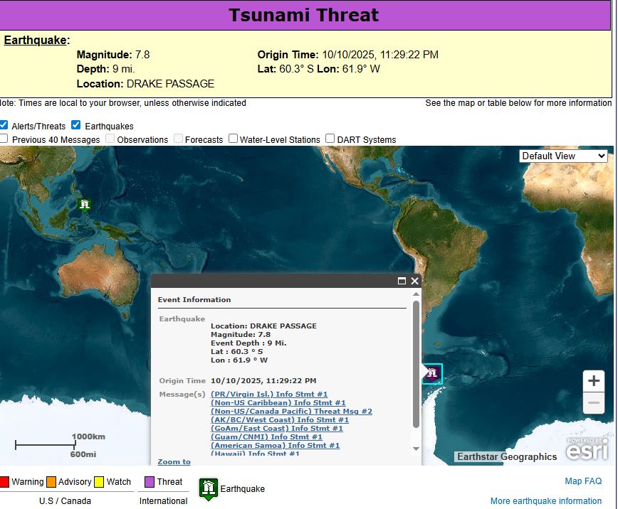 CHILE’S SHOA MARITIME AUTHORITY ISSUES TSUNAMI PRECAUTION ALERT FOR ANTARCTIC TERRITORY AFTER MAGNITUDE 7.8 EARTHQUAKE STRIKES DRAKE PASSAGE
