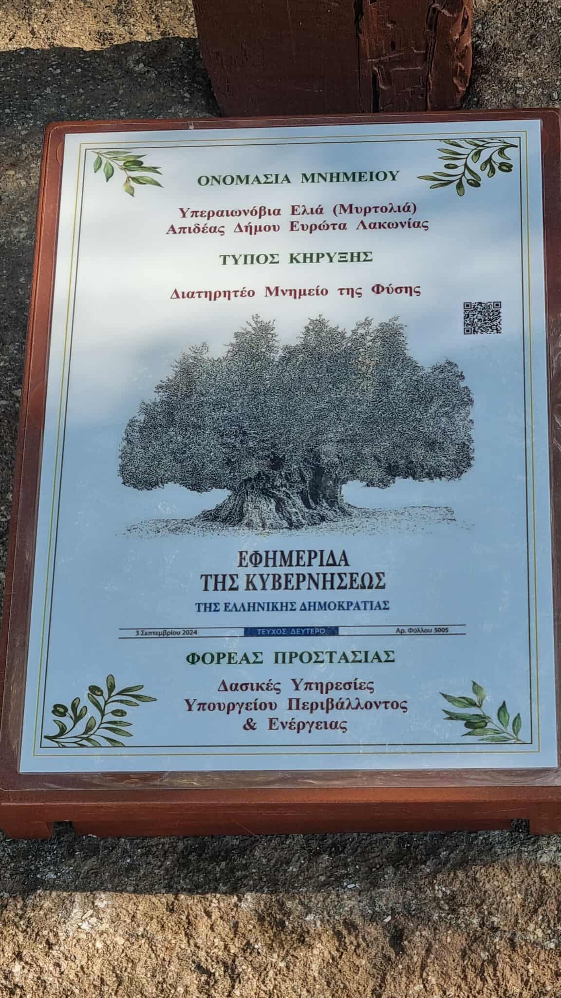 Λακωνία: Σήμανση της Γηραιότερης Ελιάς της Πελοποννήσου με εκτιμώμενη ηλικία 2.000 χρόνων