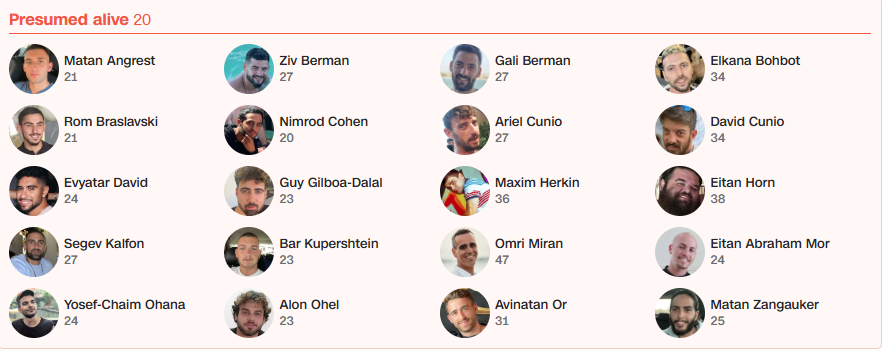 Το Ισραήλ αναφέρει ότι από τους 250 που αρχικά αιχμαλωτίστηκαν στην επίθεση της Χαμάς στις 7 Οκτωβρίου, 20 από τους ομήρους που παραμένουν στη Γάζα πιστεύεται ότι είναι ζωντανοί και 28 είναι νεκροί. Ο νεότερος είναι 20 ετών και ο μεγαλύτερος 46