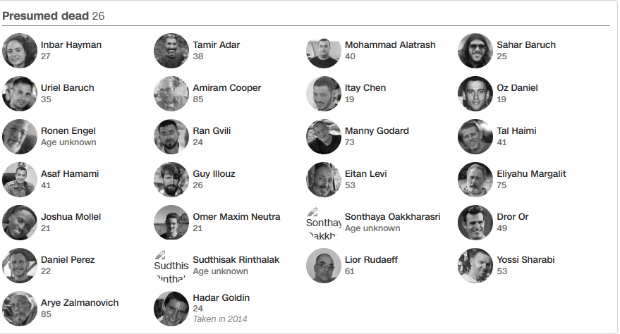 Για δύο ομήρους, τον 24χρονο Bipin Joshi, φοιτητή από το Νεπάλ καθώς και για τον 20χρονο Ισραηλινό στρατιώτη Tamir Nimrodi, δεν έχει αποσαφηνιστεί εάν συγκαταλέγονται στους εν ζωή ή όχι ομήρους.