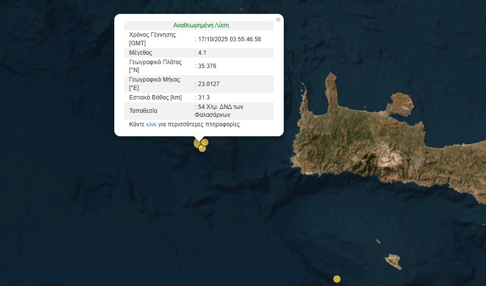 Σεισμός 4,1 βαθμών στα Φαλάσαρνα της Κρήτης