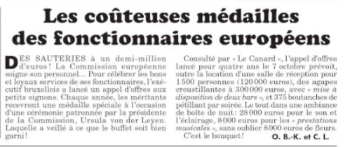 Στις 16 Οκτωβρίου 2025, η γαλλική σατιρική εφημερίδα “Le Canard enchaîné” αποκάλυψε λεπτομέρειες από τον προϋπολογισμό τετραετών τελετών που η Ευρωπαϊκή Επιτροπή σχεδιάζει για την τιμητική απονομή μεταλλίων σε επίλεκτους ευρωϋπαλλήλους.
