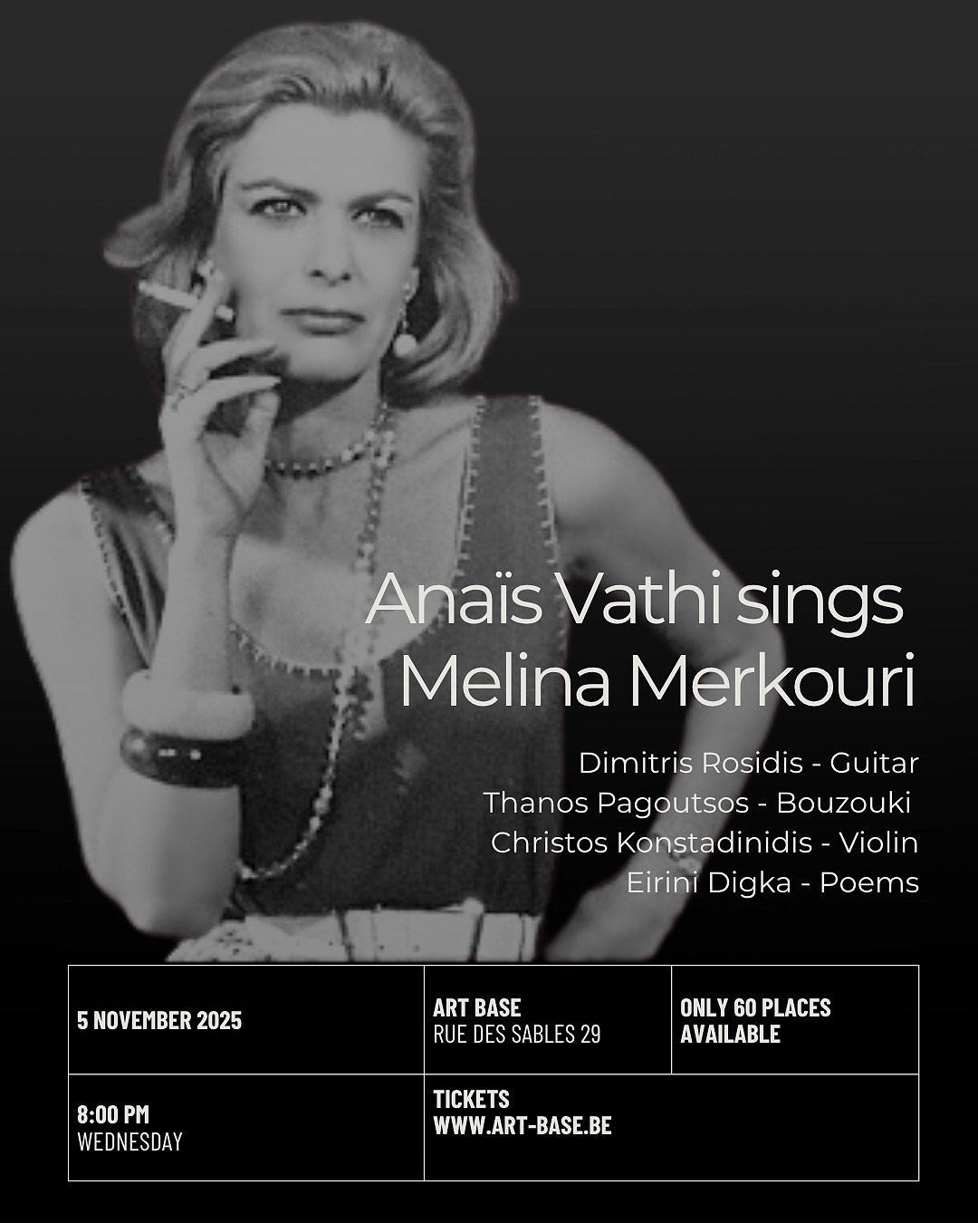 Μια ξεχωριστή μουσική παράσταση αφιερωμένη στη θρυλική Μελίνα Μερκούρη — τη γυναίκα-σύμβολο του ελληνικού πάθους, της τέχνης και της ελευθερίας, παρουσιάζει στις Βρυξέλλες η Αναΐς Βάθη.