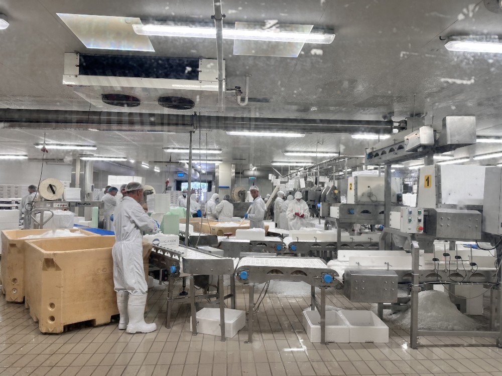 Εκεί απασχολούνται περίπου 120 άτομα, εκ των οποίων 75–80 εργάζονται καθημερινά σε μία πρωινή βάρδια. «Δεν υπάρχει λόγος για δεύτερη βάρδια, γιατί τα ψάρια που συσκευάζουμε φεύγουν την ίδια μέρα για το εξωτερικό, με τελευταίο φορτηγό να αναχωρεί στις 16:00 για να προλάβει το φέρι προς Ιταλία».