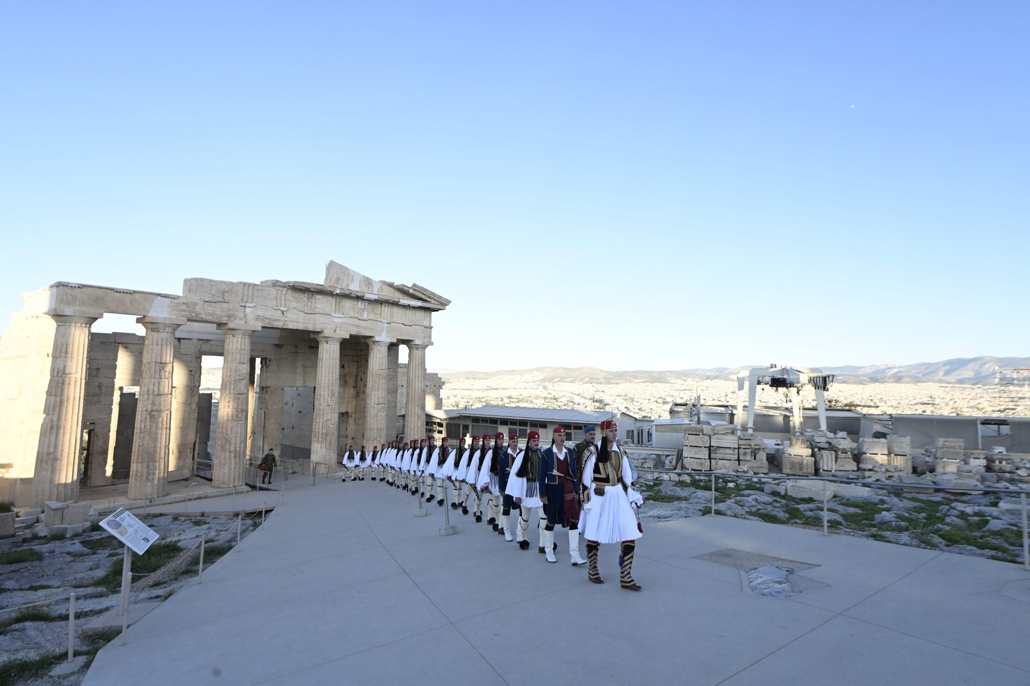 Όσοι βρέθηκαν το πρωί της Δευτέρας στον Ιερό Βράχο παρακολούθησαν τους Εύζωνες της Προεδρικής Φρουράς να υψώνουν τη γαλανόλευκη στον ιστό, ενώ η ατμόσφαιρα γέμισε συγκίνηση με την ανάκρουση του Εθνικού Ύμνου.
