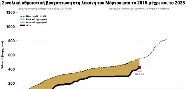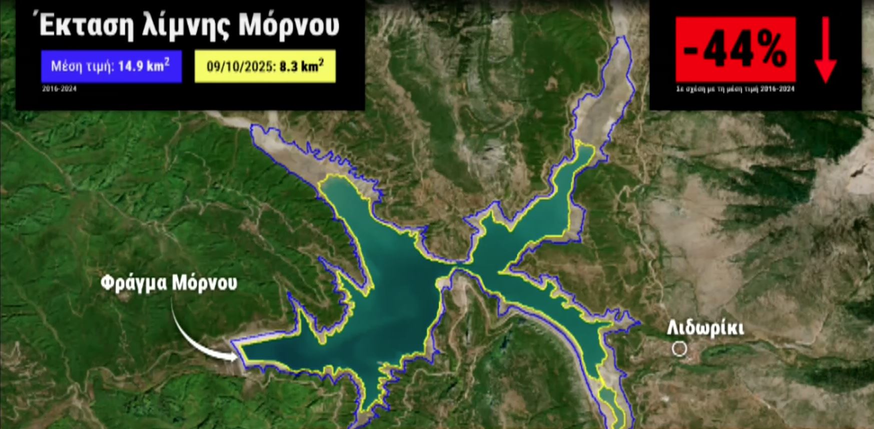 Σύμφωνα με ρεπορτάζ του ΕΡΤnews, τα αποθέματα νερού στον Μόρνο εμφανίζονται μειωμένα κατά 44% σε σχέση με τον μέσο όρο των τελευταίων ετών, ενώ η συνολική ποσότητα νερού στους ταμιευτήρες της χώρας έχει πέσει στα 377 εκατομμύρια κυβικά μέτρα, από 596 εκατομμύρια πέρυσι την ίδια εποχή, συνολικά στη χώρα.