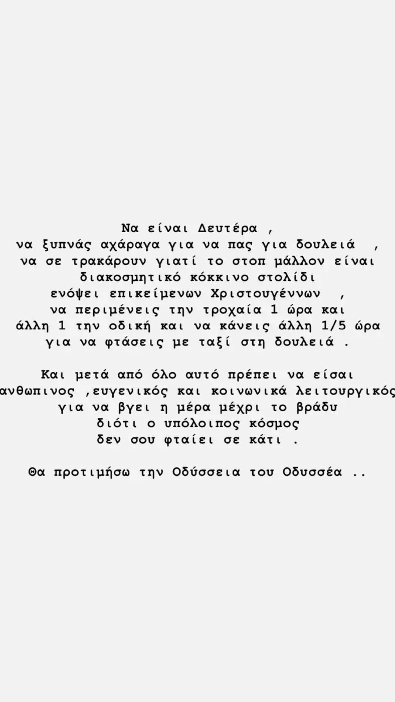 «Να είναι Δευτέρα, να ξυπνάς αχάραγα για να πας για δουλειά, να σε τρακάρουν γιατί το στοπ μάλλον είναι διακοσμητικό κόκκινο στολίδι ενόψει επικείμενων Χριστουγέννων, να περιμένεις την τροχαία 1 ώρα και άλλη 1 την οδική και να κάνεις άλλη 1/5 ώρα για να φτάσεις με ταξί στη δουλειά.