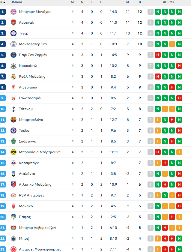 Η 4η αγωνιστική της φάσης των ομίλων του Champions League ολοκληρώθηκε, με την κατάσταση στην κορυφή να παραμένει ιδιαίτερα ανταγωνιστική. Η Μπάγερν Μονάχου και η Άρσεναλ έκαναν τα καθήκοντά τους, επικρατώντας της Παρί Σεν Ζερμέν και της Σλάβια Πράγας αντίστοιχα, ενώ και η Ίντερ δεν έλειψε από τη «μάχη», παίρνοντας την τρίτη νίκη της κόντρα στην Καϊράτ με 2-1. Οι τρεις αυτές ομάδες μοιράζονται πλέον την κορυφή του ομίλου, με τη βαθμολογία να είναι αρκετά ανοιχτή ενόψει της συνέχειας.