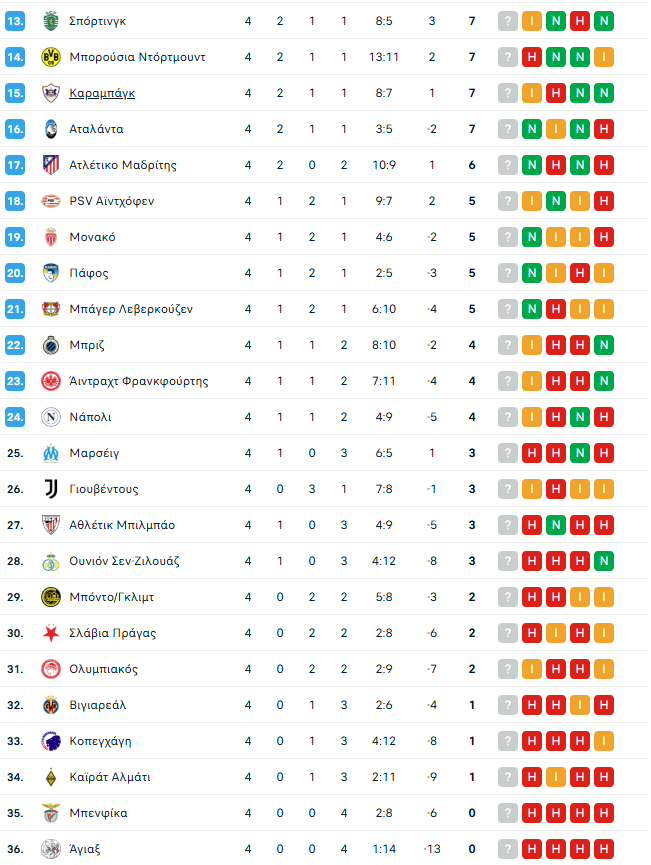 Η αναλυτική βαθμολογία του Champions League μετά την 4η αγωνιστική