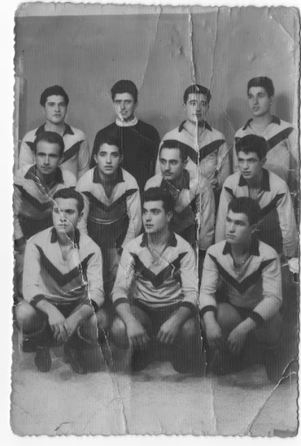 η β’ ομάδα του Προμποναϊκού στο πρώτο μισό της δεκαετίας του 1960, με τον Γ. Ουσταμπασίδη πρώτο όρθιο από δεξιά, φωτο στην αλάνα της Ριζούπολης. Προσέχουμε τα χαλίκια στον αγωνιστικό χώρο, αλλά και τον χαρούμενο πιτσιρικά που απολαμβάνει τη στιγμή