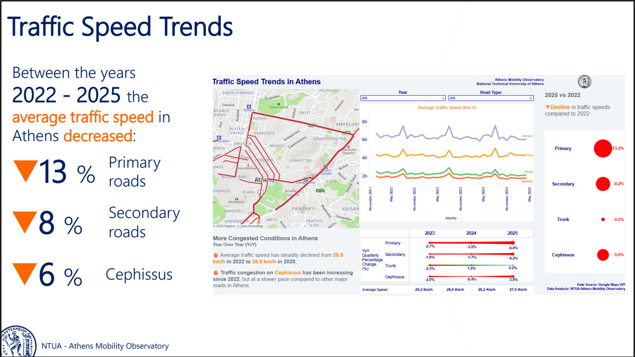 «Από το 2022, μετά την πανδημία, μέχρι το 2025, έχουμε δει να υπάρχει μία μείωση της μέσης ταχύτητας κυκλοφορίας στο Λεκανοπέδιο της τάξης του 13%. Εάν συνεχίσουμε έτσι, αυτό θα φτάσει έως και 50% μέχρι το 2030. Και από ότι φαίνεται έτσι θα συνεχίσουμε, διότι δεν υπάρχει κάποια σοβαρή δράση αυτή τη στιγμή για να αναστραφεί η κατάσταση», δήλωσε χαρακτηριστικά ο κ. Γιαννής.