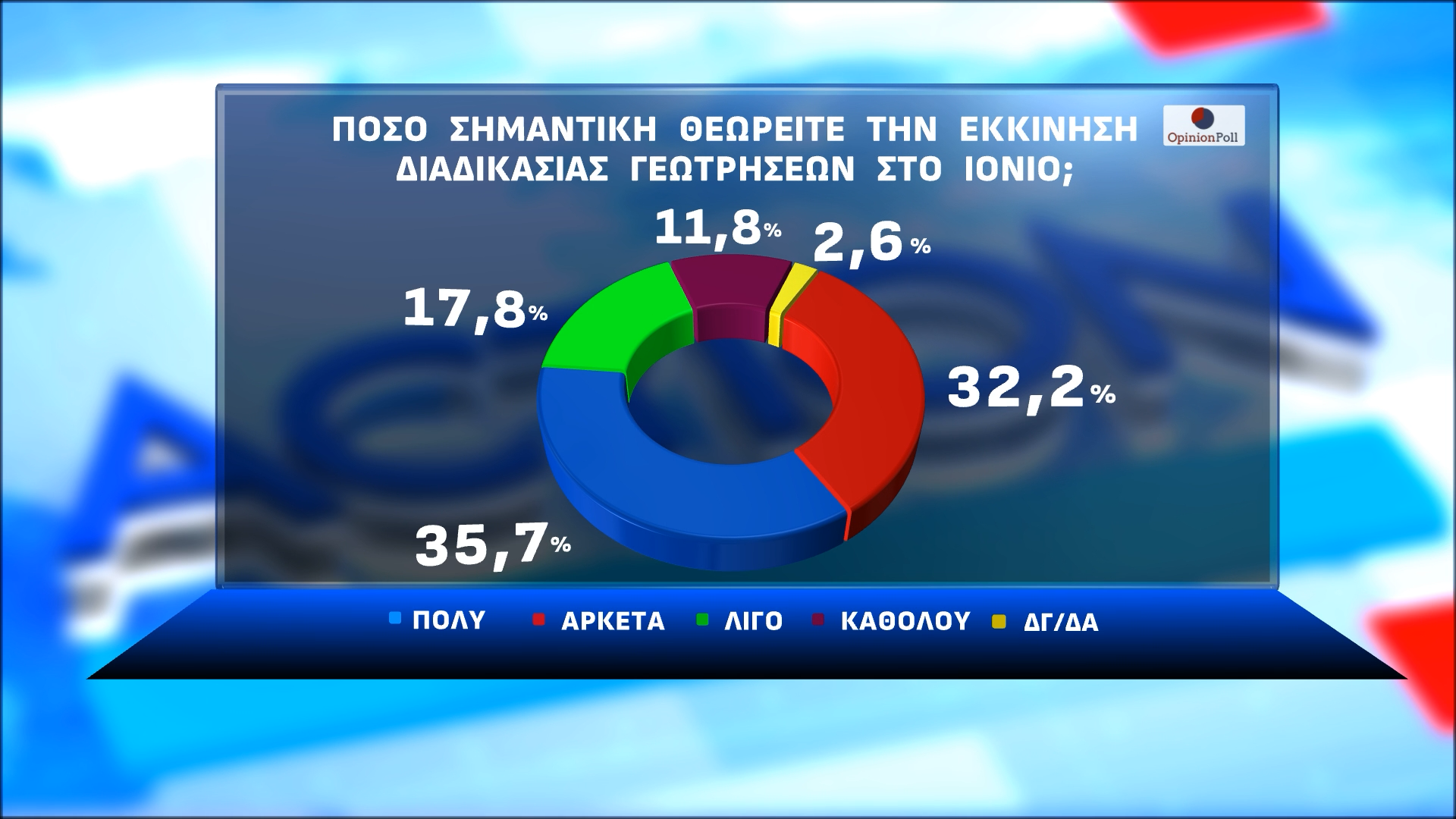 Στο πόσο σημαντική θεωρείτε την εκκίνηση διαδικασίας γεωτρήσεων στο Ιόνιο το 35,7% λέει πολύ, το 32,2% αρκετά, το 17,8% λίγο και το 11,8% καθόλου.