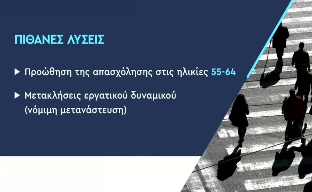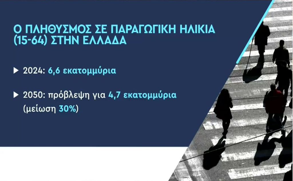 Ο κ. Αλεξόπουλος υπογράμμισε ότι ο παραγωγικός πληθυσμός της χώρας, ηλικίας 15 έως 64 ετών, θα μειωθεί κατά περίπου 2 εκατομμύρια άτομα μέχρι το 2050.