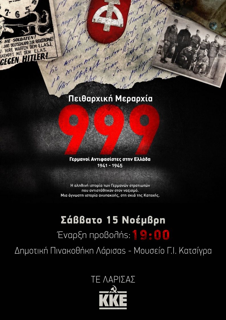 Η Τομεακή Επιτροπή Λάρισας του ΚΚΕ προβάλλει την ταινία «Η Πειθαρχική Μεραρχία “999 “», σε σκηνοθεσία Κώστα Σταματόπουλου, το Σάββατο 15 Νοεμβρίου, στις 7 μ.μ., στο αμφιθέατρο της Δημοτικής Πινακοθήκης Λάρισας.