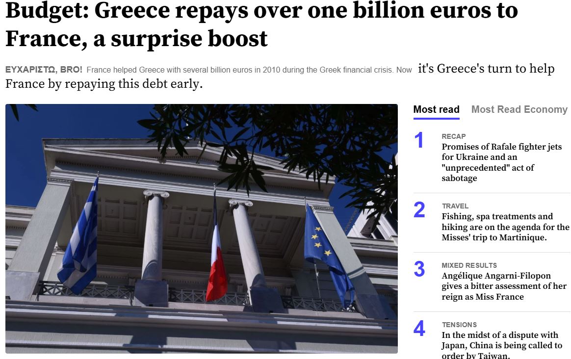 «Η Αθήνα προχώρησε πρόσφατα σε πρόωρη αποπληρωμή 1,1 δισεκατομμυρίου ευρώ στο Παρίσι. Μια ευπρόσδεκτη πληρωμή εν μέσω δημοσιονομικής κρίσης, ενώ στις αρχές της δεκαετίας του 2010, η Γαλλία ήταν αυτή που έσπευδε να βοηθήσει την Ελλάδα.»