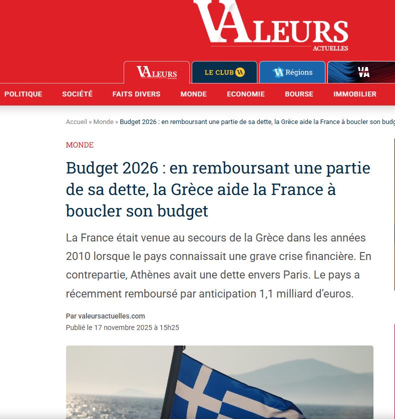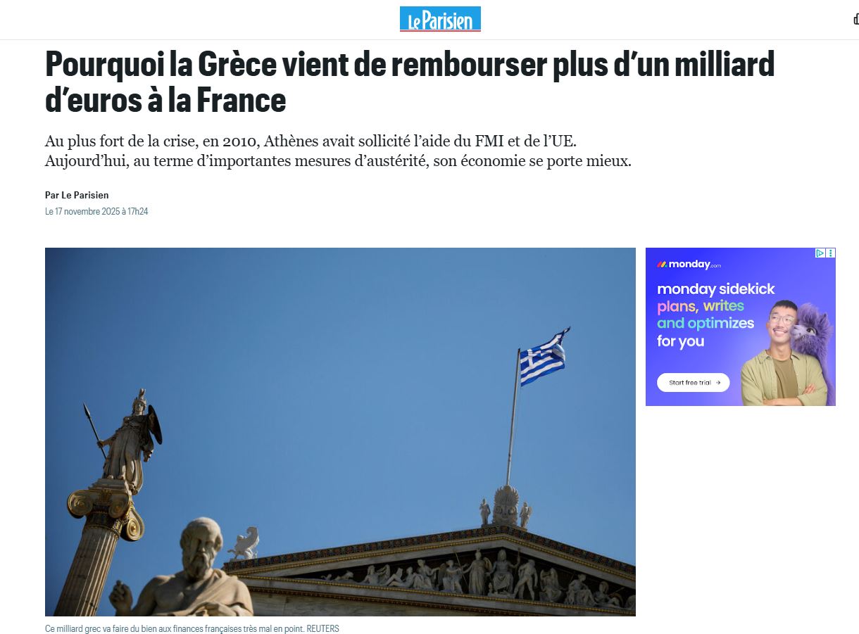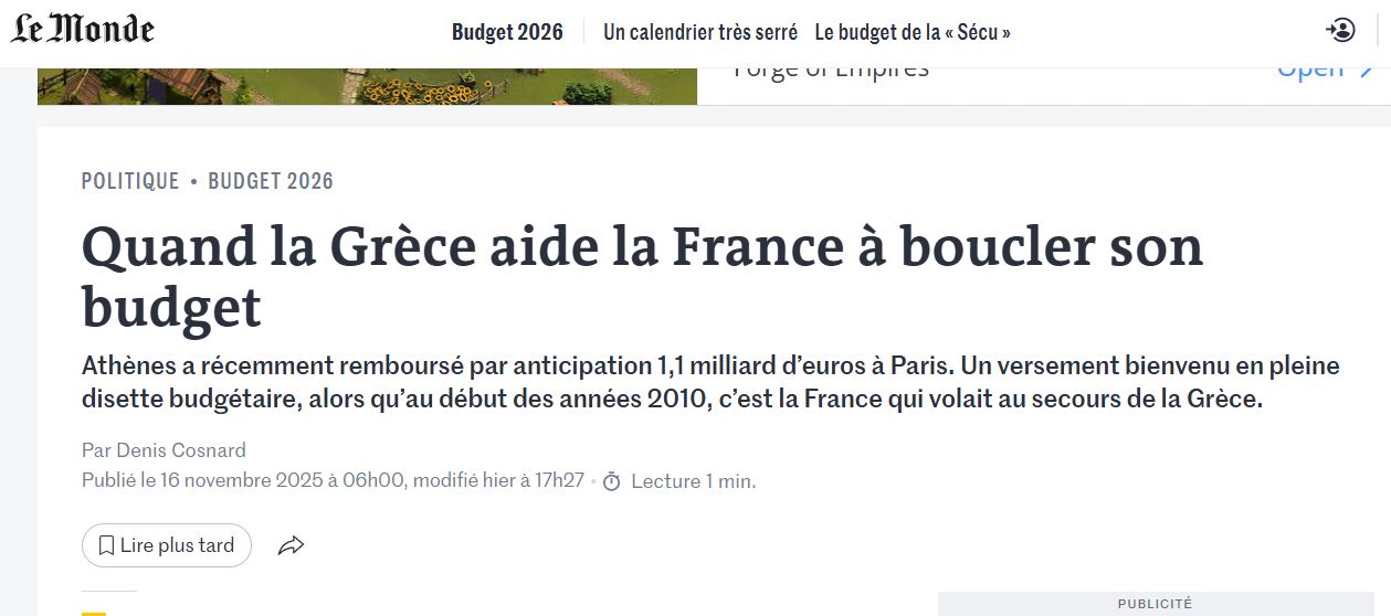 Όπως γράφει, η τάση αντιστρέφεται. Τα δημόσια οικονομικά επιδεινώνονται στη Γαλλία. Σύμφωνα με τον Υπουργό Οικονομικών, το δημόσιο χρέος ανερχόταν σε 3.416,3 δισεκατομμύρια ευρώ ή 115,6% του ΑΕΠ στο τέλος του δεύτερου τριμήνου του 2025. Σε αυτό το πλαίσιο η Γαλλία έλαβε καλά νέα από την Αθήνα. Εν μέσω της εξέτασης του σχεδίου νόμου για τον προϋπολογισμό (PLF) και του σχεδίου νόμου για τη χρηματοδότηση της κοινωνικής ασφάλισης (PLFSS), μέλη του κοινοβουλίου και γερουσιαστές ανακάλυψαν, διαβάζοντας τα κείμενα, ότι η Ελλάδα είχε αποπληρώσει στη Γαλλία 1,1 δισεκατομμύρια ευρώ προκαταβολικά.