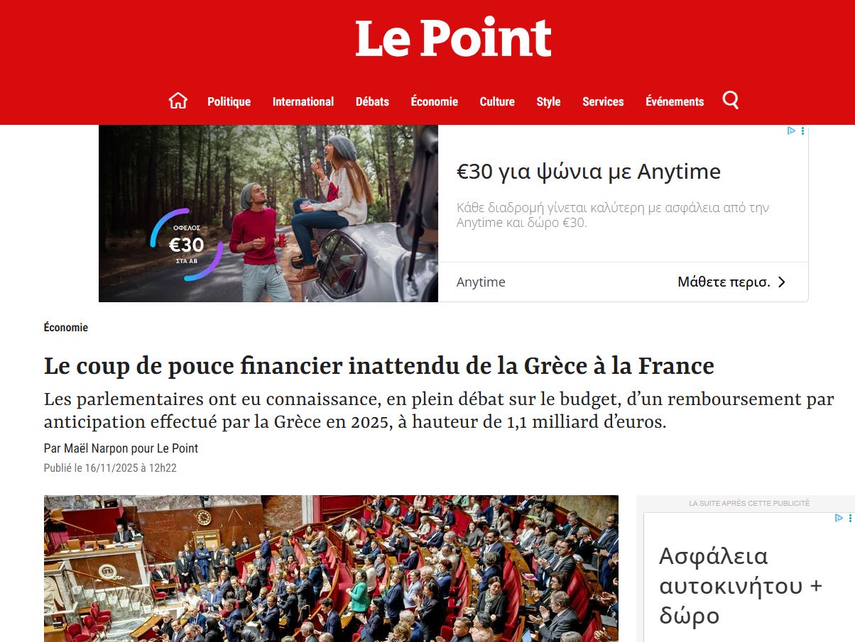 Le point: «Η απροσδόκητη οικονομική ώθηση της Ελλάδας προς τη Γαλλία. Οι βουλευτές έμαθαν, εν μέσω της συζήτησης για τον προϋπολογισμό, για μια πρόωρη αποπληρωμή από την Ελλάδα το 2025, ύψους 1,1 δισεκατομμυρίου ευρώ.»