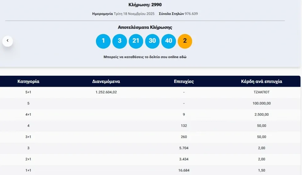 Οι τυχεροί αριθμοί της κλήρωσης είναι οι εξής: 1, 3, 21, 30, 40 και Τζόκερ ο αριθμός 2.