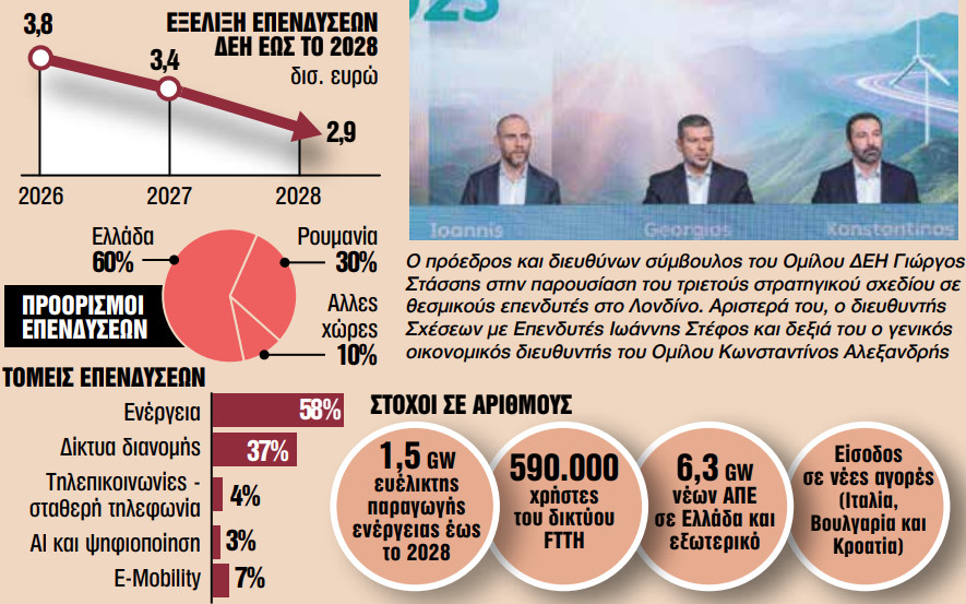 Στρατηγικές επενδύσεις 10,1 δισ. ευρώ στην τριετία 2026-2028, με το 93% των κεφαλαίων αυτών να κατευθύνεται σε νέα έργα και στόχο τα EBITDA να φτάσουν τα 2,9 δισ. ευρώ, ανακοίνωσε χθες στο Λονδίνο η διοίκηση της ΔΕΗ παρουσιάζοντας στους θεσμικούς επενδυτές τους στόχους του Ομίλου, στο πλαίσιο του Capital Markets Day 2025.
