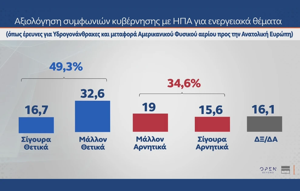 Όσον αφορά τις ενεργειακές συμφωνίες που σύναψε η Ελλάδα με τις ΗΠΑ, το 49,3% έχει θετική άποψη, έναντι του 34,6% που αντιμετωπίζει αρνητικά την εξέλιξη.