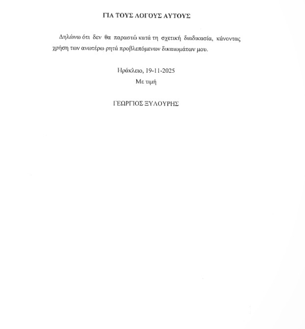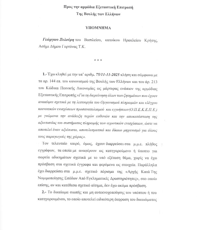 Ο Γιώργος Ξυλούρης, γνωστός με το προσωνύμιο «Φραπές», ενημέρωσε την Εξεταστική Επιτροπή για τον ΟΠΕΚΕΠΕ ότι δεν θα προσέλθει για κατάθεση όπως είχε αρχικά προγραμματιστεί. Αντί της προσωπικής του παρουσίας, απέστειλε υπόμνημα στα μέλη της Επιτροπής, με το οποίο παρέχει τις απαραίτητες πληροφορίες για την έρευνα.