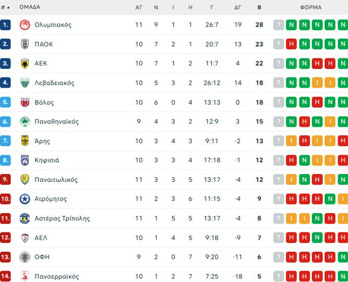 Στο «Γεώργιος Καραϊσκάκης», ο Ολυμπιακός δεν δυσκολεύτηκε να επικρατήσει του Ατρόμητου με 3-0, διατηρώντας έτσι την κορυφή του βαθμολογικού πίνακα με 28 πόντους. Από την άλλη, η ομάδα του Περιστερίου παρέμεινε στους 9 πόντους και την 10η θέση.
