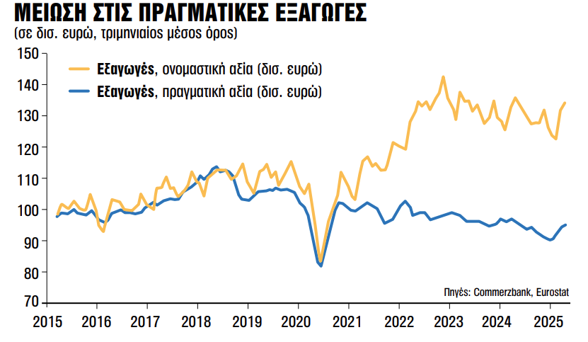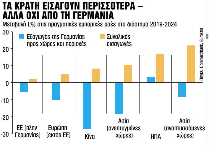 Μήπως, όμως, η πραγματικότητα είναι διαφορετική; Ενδεχομένως ναι, ειδικά αν κρίνουμε από τις μελέτες και τις εκτιμήσεις των ειδικών. Ανάμεσά τους και της Commerzbank, ενός από τα τραπεζικά μεγαθήρια της Γερμανίας, όπως φανερώνει πρόσφατη εσωτερική της μελέτη, υπό τον τίτλο «Η υποχώρηση του Made in Germany»: «Οι εξαγωγές γερμανικών αγαθών ακολουθούν μια σταθερά καθοδική πορεία. Οι εποχές της ευημερίας για τις εξαγωγές Made in Germany ανήκουν προ πολλού στο παρελθόν. Κάτι που οφείλεται πιθανότατα στην Κίνα και τη μείωση της ανταγωνιστικότητας της Γερμανίας. Η δασμολογική πολιτική του Τραμπ και οι χαμηλότεροι ρυθμοί ανάπτυξης στην Ευρώπη πυκνώνουν τα σύννεφα στον ορίζοντα. Η τάση προς τις υψηλότερες επενδύσεις στο εξωτερικό και την αποβιομηχάνιση στο εσωτερικό φαίνεται πως θα συνεχιστεί».