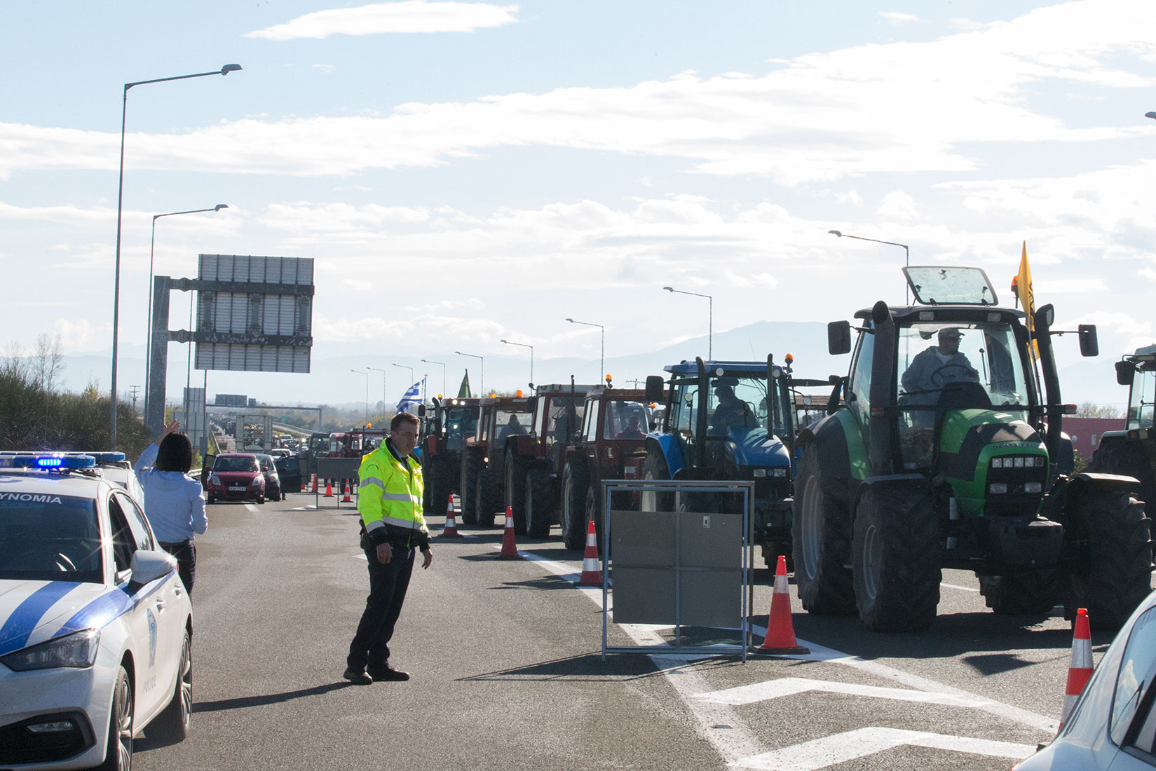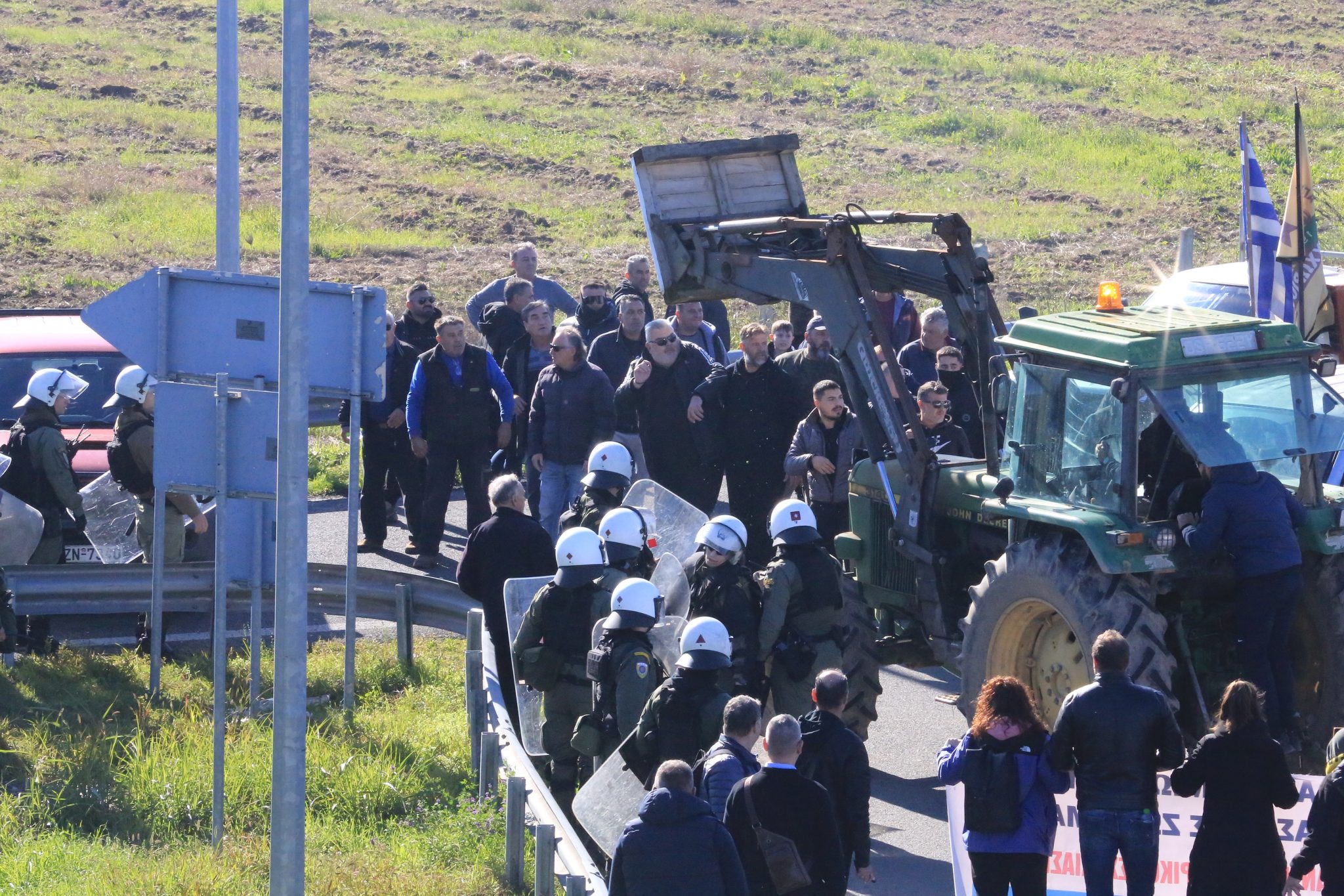 Είχε προηγηθεί ένταση, όταν οι αγρότες έσπρωχναν τις κλούβες για να περάσουν με τα τρακτέρ κανονικά από την Εθνική Οδό, με αποτέλεσμα να υπάρξουν συγκρούσεις και οι αστυνομικοί να απαντήσουν με εκτεταμένη χρήση χημικών και κρότου λάμψης.