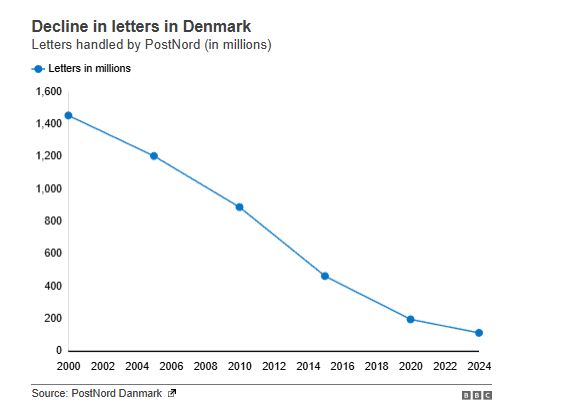 Η κρατική ταχυδρομική υπηρεσία της Δανίας, PostNord, πρόκειται να τερματίσει όλες τις παραδόσεις επιστολών στα τέλη του 2025, όπως ανακοίνωσε πρόσφατα, επικαλούμενη μείωση 90% στον όγκο των επιστολών από τις αρχές του αιώνα.