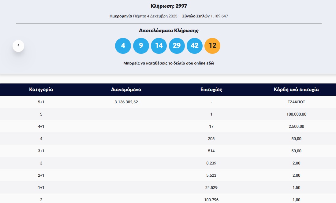 Πραγματοποιήθηκε το βράδυ της Πέμπτης (4/12) η κλήρωση 2997 του Τζόκερ που μοιράζει στην πρώτη κατηγορία 3.136.302 ευρώ.