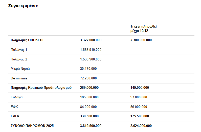 Κατά το διάστημα από 1η Ιανουαρίου έως 31 Δεκεμβρίου 2025 προβλέπεται ότι θα έχουν καταβληθεί στους αγρότες 3,8 δις ευρώ από τον ΟΠΕΚΕΠΕ, τον Κρατικό Προϋπολογισμό και τον ΕΛΓΑ.