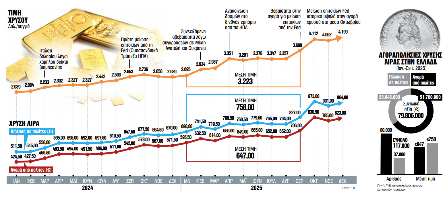 Αντίστοιχα, οι τιμές χρυσής λίρας στην ΤτΕ έχουν ακολουθήσει ανοδική πορεία: στις 31 Δεκεμβρίου 2024 η κεντρική τράπεζα αγόραζε στα 568,5 ευρώ και πουλούσε στα 666,31 ευρώ, ενώ στις 5 Δεκεμβρίου 2025 οι τιμές είχαν διαμορφωθεί στα 822,55 και 963,72 ευρώ αντίστοιχα – αύξηση περίπου 45%.