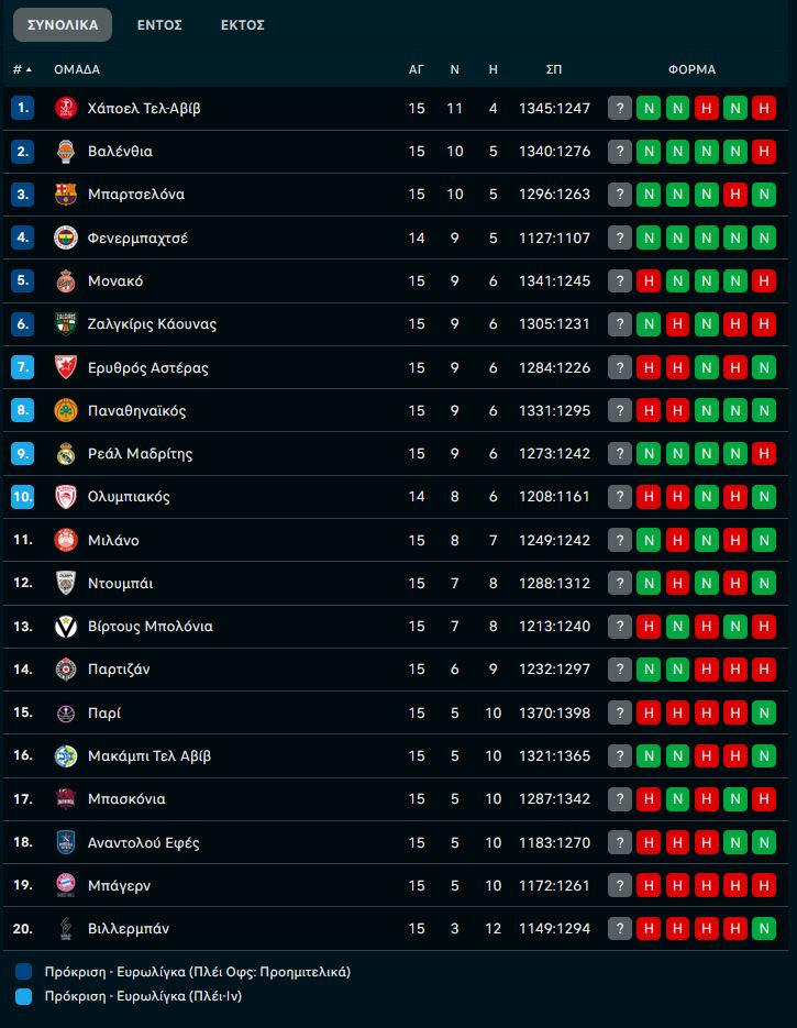 Στην κορυφή παραμένει σταθερά η Χάποελ που πέρασε και από την Μπολόνια με το 79-74 κόντρα στη Βίρτους. Στο ντέρμπι της βραδιάς η Παρτιζάν πήρε σπουδαία νίκη με 79-76 επί του Ερυθρού Αστέρα στο φινάλε. Χαμηλά στο μεταξύ βρίσκεται και ο Παναθηναϊκός που υποχώρησε στην 8η θέση μετά την ήττα από την Αρμάνι στο Μιλάνο πριν από 24 ώρες.