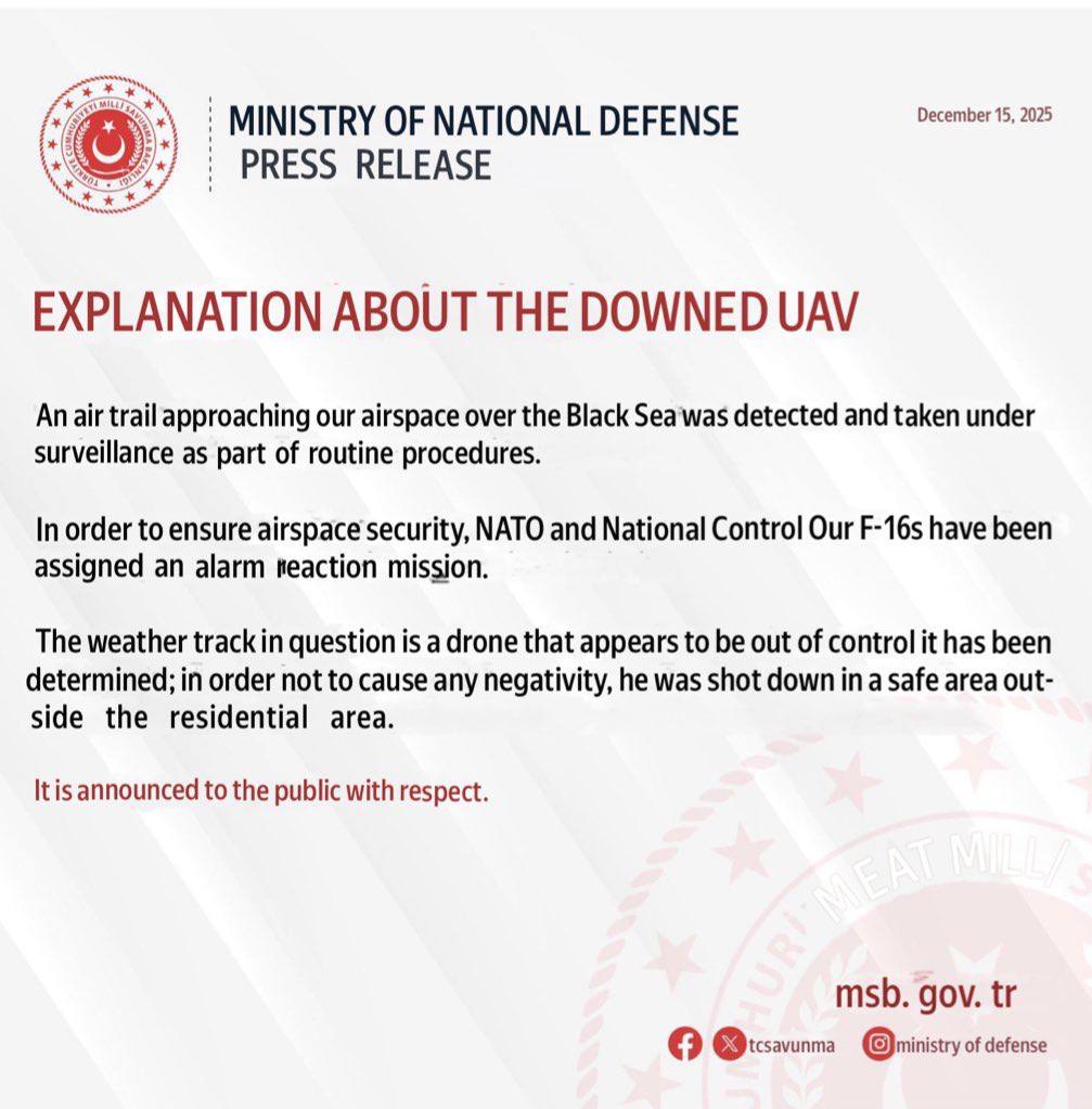 Ένα μη αναγνωρισμένο drone, πλησίαζε τον τουρκικό εναέριο χώρο από την Μαύρη Θάλασσα. Σύμφωνα με τις πρώτες πληροφορίες η τουρκική αεροπορία σήκωσε ένα F-16 το οποίο κατέστρεψε τον στόχο σε μια «ασφαλή ζώνη» — μακριά από κατοικημένες περιοχές — για να εξαλείψει κάθε απειλή για τους πολίτες.