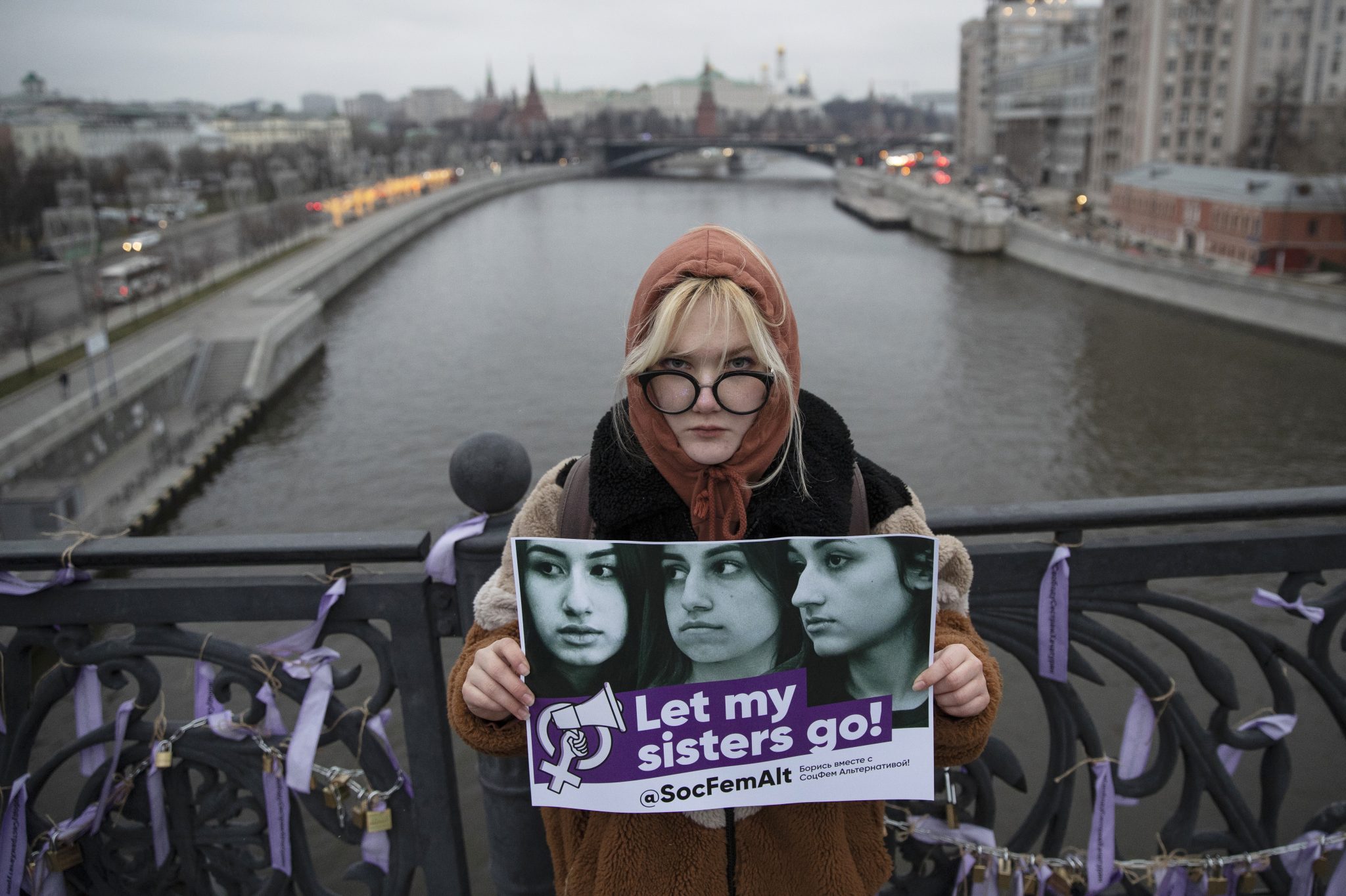 Διαδηλώτρια κρατά πανό με τα πορτρέτα των αδελφών Χατσατουριάν (Khachaturyan sisters) κατά τη διάρκεια δράσης ενάντια στην ενδοοικογενειακή βία στη Μόσχα, τον Δεκέμβριο του 2019. Οι Κρεστίνα, Αγγελίνη και Μαρία Χατσατουριάν κατηγορήθηκαν για τον φόνο του πατέρα τους το 2018, υποστηρίζοντας ότι ενήργησαν μετά από χρόνια σωματικής και σεξουαλικής κακοποίησης. Το 2025, δικαστήριο της Μόσχας αναγνώρισε επισήμως ότι ο πατέρας είχε κακοποιήσει συστηματικά τις τρεις αδελφές, μια εξέλιξη που μπορεί να οδηγήσει σε αναθεώρηση των κατηγοριών εις βάρος τους και για μεταρρυθμίσεις στον τρόπο που η δικαιοσύνη βλέπει περιπτώσεις κακοποίησης εντός οικογένειας.(AP Photo/Pavel Golovkin)