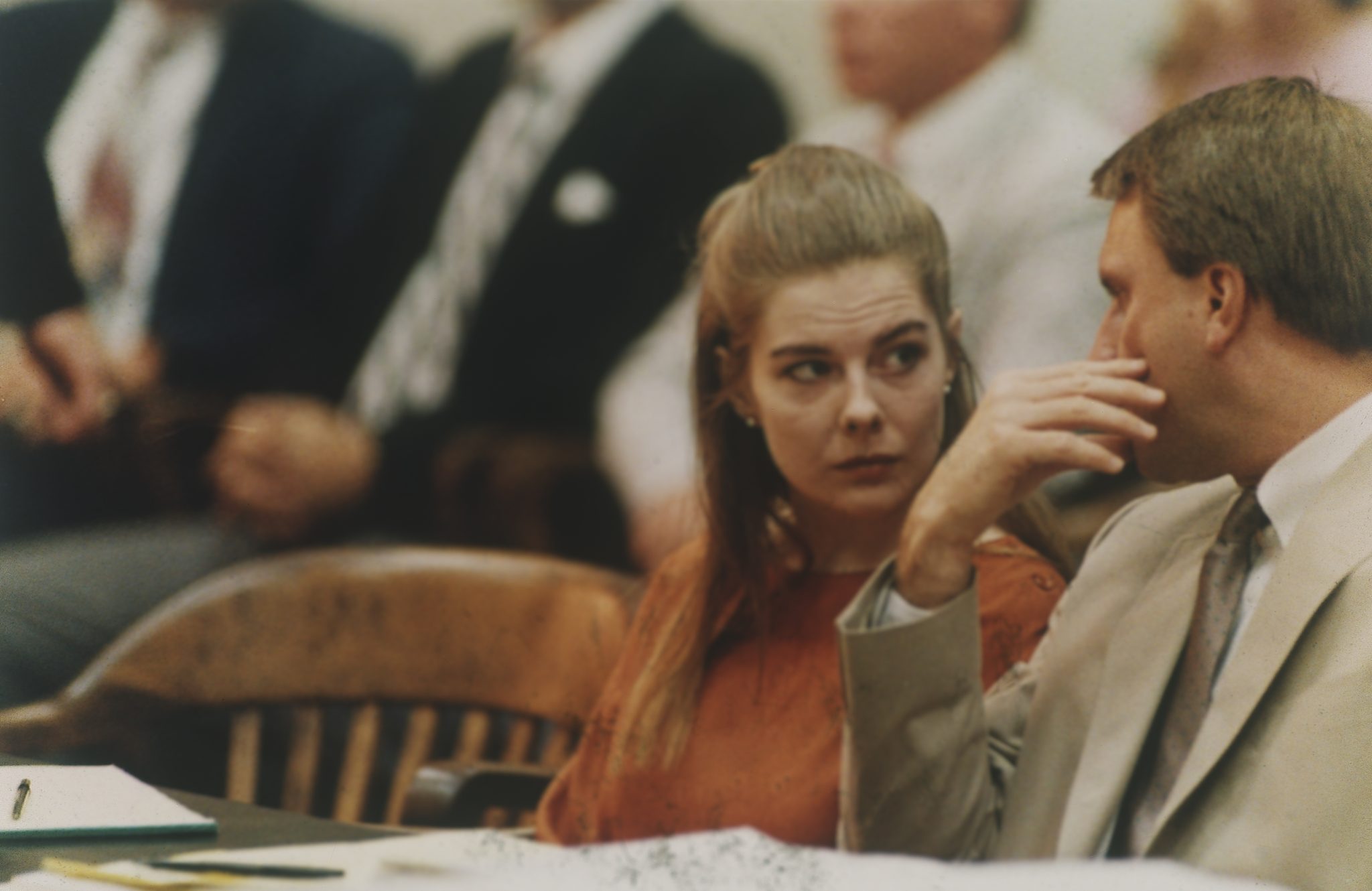 Η Ελίζαμπεθ Χέισομ συνομιλεί με τον δικηγόρο της, Ντρου Ντέιβις στο Δικαστήριο της Κομητείας Μπέντφορντ στη Βιρτζίνια στις 24 Αυγούστου 1987, αφού παραδέχτηκε την ενοχή της σε δύο κατηγορίες ως συνεργός πριν από τη δολοφονία των γονιών της. Οι Ντέρεκ και Νάνσι Χέισομ βρέθηκαν άγρια δολοφονημένοι στο σπίτι τους το 1985, σε μια υπόθεση που συγκλόνισε τις ΗΠΑ και οδήγησε επίσης στην καταδίκη του τότε συντρόφου της, Γενς Σόρινγκερ. (AP Photo/Pool/Doughtie)