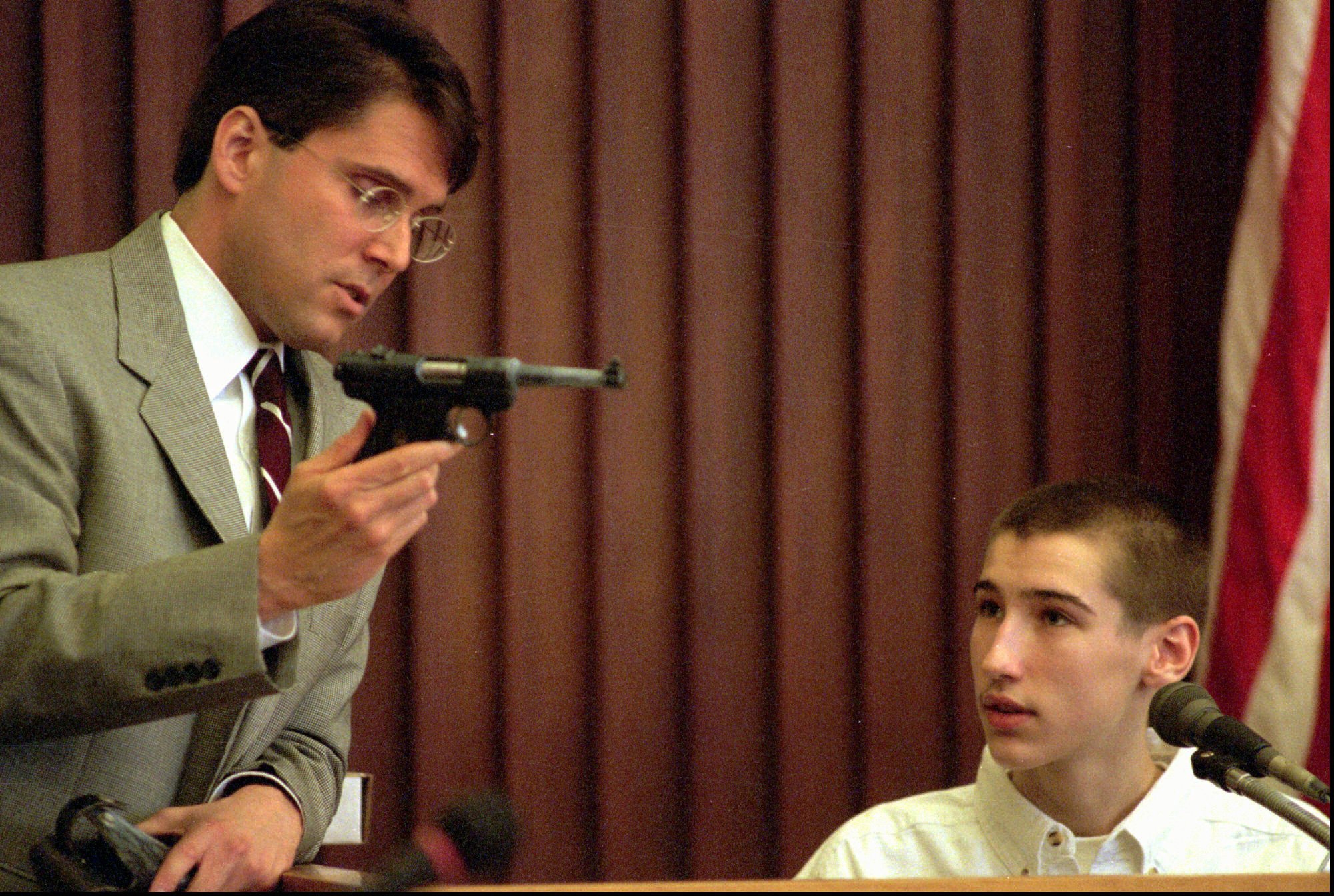 Μάιος 1997. Ο 15χρονος τότε Τζέφρι Ντίνγκμαν στο δικαστήριο του Νιού Χάμσαϊρ, καθώς οι αρχές παρουσιάζουν το πιστόλι που χρησιμοποιήθηκε στη δολοφονία των γονιών του το 1996. Ο Τζέφρι και ο μεγαλύτερος αδελφός του Ρόμπερτ περιέγραψαν ότι ζούσαν σε ένα περιβάλλον έντασης και αυστηρότητας που δεν τους άφηνε καμία πραγματική επιλογή. Ζούσαν μια σκληρή καθημερινότητα όπου ένιωθαν παγιδευμένοι, χωρίς διέξοδο και χωρίς τη στήριξη κανενός. (AP Photo/Jim Cole, File)