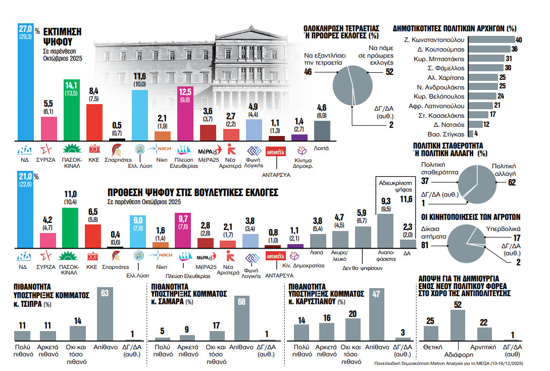 Τα περισσότερα κόμματα της αντιπολίτευσης, από την άλλη, καταγράφουν μικρότερη ή μεγαλύτερη ενίσχυση στα ποσοστά τους. Το ΠΑΣΟΚ ακολουθεί με 14,1% (από 13,5% του Νοεμβρίου) και η Πλεύση Ελευθερίας περνά στην τρίτη θέση με 12,5%. Πρόκειται για αξιοσημείωτη αύξηση 2,7 μονάδων, η οποία προφανώς οφείλεται στην αποδοχή της παρουσίας της προέδρου της, Ζωής Κωνσταντοπούλου, στην εξεταστική επιτροπή για τον ΟΠΕΚΕΠΕ. Ενδεικτικό είναι άλλωστε πως αύξησε κατά πέντε μονάδες το ποσοστό δημοφιλίας της στην ίδια μέτρηση. Μια θέση πιο κάτω υποχωρεί η Ελληνική Λύση με 11,6%, ενισχυμένη ωστόσο περί τη μιάμιση μονάδα από τον Νοέμβριο. Επίσης, το ΚΚΕ, κόμμα με ισχυρή παρουσία στις αγροτοκτηνοτροφικές διεκδικήσεις, μετριέται 8,4%, σχεδόν μία μονάδα παραπάνω. Από την άλλη, ο ΣΥΡΙΖΑ, αντιμετωπίζοντας και τα εσωτερικά βάρη που προκαλεί η διαφαινόμενη επιστροφή του Αλέξη Τσίπρα, καταγράφει καθοδική πορεία, με το ποσοστό του στην εκτίμηση ψήφου να φτάνει το 5,5%. Η Φωνή Λογικής τον πλησιάζει με 4,9%.
