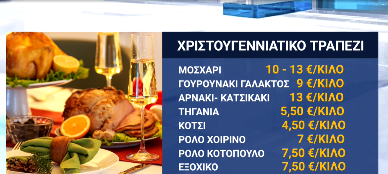 Η τιμή του μοσχαρίσιου κρέατος κυμαίνεται από 10 μέχρι 13 ευρώ το κιλό. Γουρουνάκι γάλακτος στα 9 ευρώ. Το αρνί και το κατσίκι στα 13 ευρώ, η νωπή γαλοπούλα στα 11,50 ευρώ, ενώ η εισαγόμενη από Ιταλία στα 8,50 € το κιλό. Τηγανιά στα 5,50 ευρώ, κότσι στα 4,50 ευρώ, ρόλο χοιρινό, 7 ευρώ το κιλό, το κοτόπουλο κοστίζει 7,50 ευρώ το κιλό, όπως και το Εξοχικό.