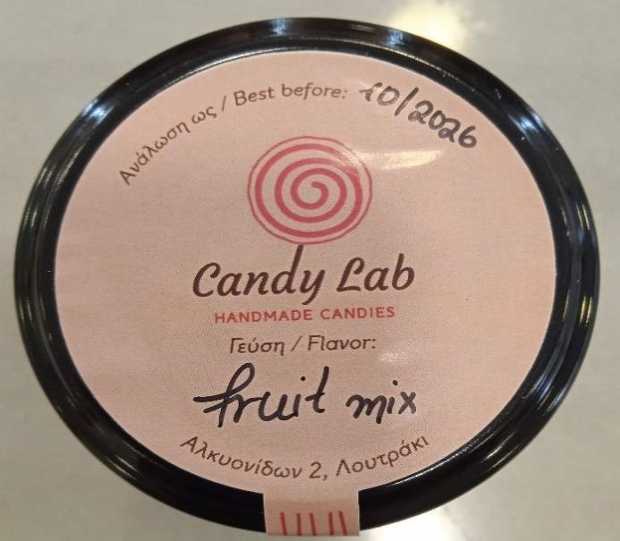 Επίσης, ο ΕΦΕΤ ανακαλεί τις καραμέλες «fruit mix» με ημερομηνία ανάλωσης ως 10/2026, συσκευασίας καθαρού βάρους περίπου 230g, το οποίο παράγεται και συσκευάζεται στην Ελλάδα από την «Candy Lab» που εδρεύει στο Λουτράκι Κορινθίας.