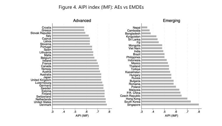 Επιπλέον, σύμφωνα με την μελέτη που δημοσιεύσει η BIS, η Ελλάδα υστερεί σε ορισμένα χαρακτηριστικά του δείκτη ετοιμότητας για την ΤΝ (AIPI), όπως η καινοτομία, οι ψηφιακές υποδομές και ιδιαίτερα το ανθρώπινο κεφάλαιο. Μόνο σε σχέση με τις αναπτυσσόμενες οικονομίες η σύγκριση δείχνει την Ελλάδα σε καλύτερη θέση, αλλά ακόμα και εκεί  βρίσκεται κάπως πάνω από τον μέσο όρο των αναδυόμενων οικονομιών… Η μελέτη δείχνει ότι «η αλληλεπίδραση μεταξύ κλαδικής έκθεσης και εθνικής ετοιμότητας είναι καθοριστική: χώρες με υψηλές επιδόσεις και στα δύο πεδία καταγράφουν σημαντικά μεγαλύτερη αύξηση της προστιθέμενης αξίας».