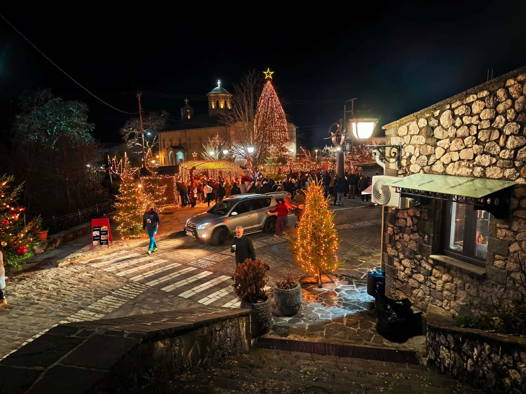 Ο στολισμός είναι πραγματικά εντυπωσιακός. Χιλιάδες λαμπιόνια αγκαλιάζουν τα πέτρινα σπίτια και τα σοκάκια, ενώ τα ξύλινα σπιτάκια, η φάτνη και το σπίτι του Άγιου Βασίλη συνθέτουν μια εικόνα που μοιάζει να ξεπηδά από χριστουγεννιάτικο παραμύθι.