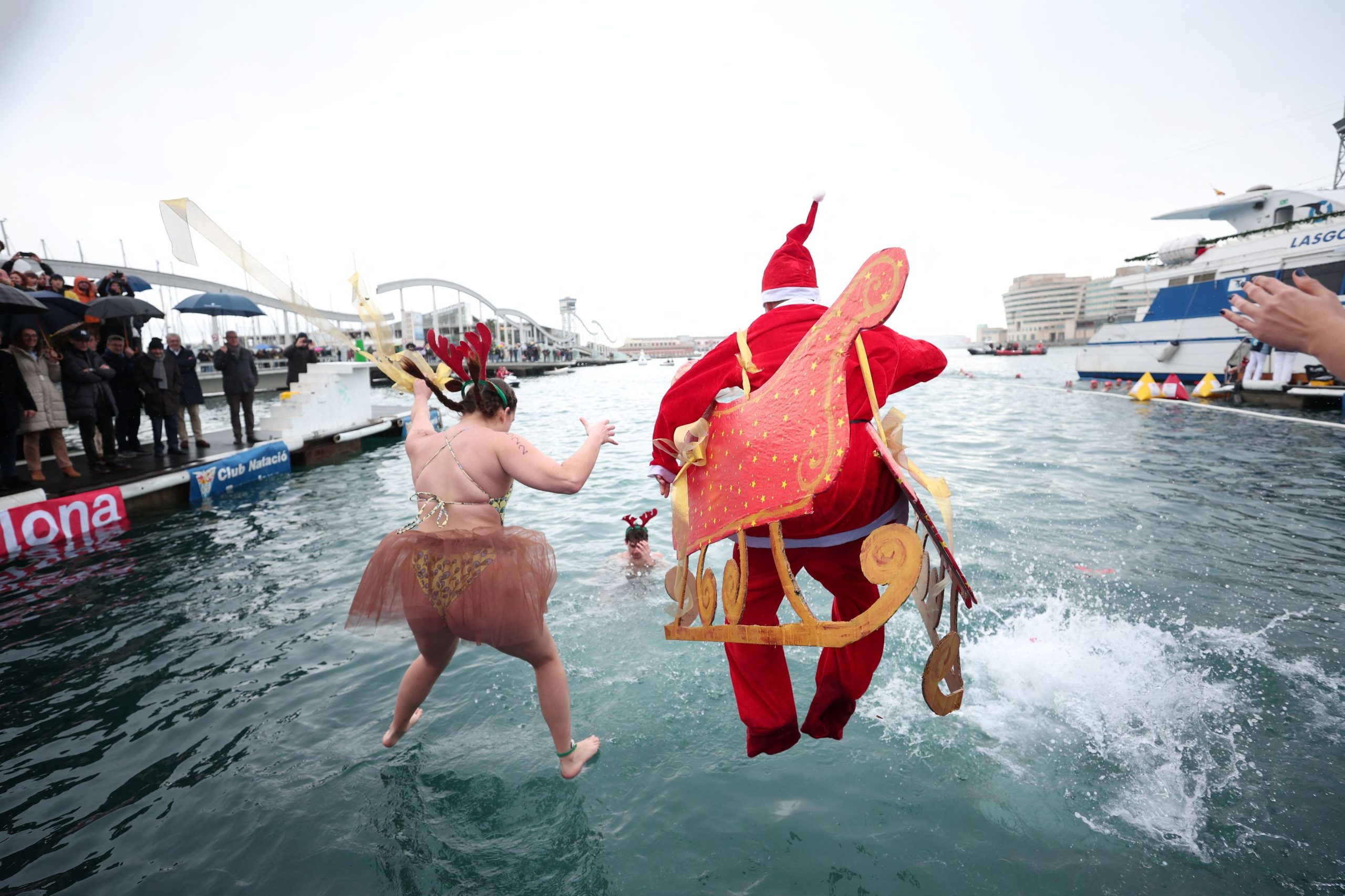 Εκατοντάδες άνθρωποι ντυμένοι με χριστουγεννιάτικες στολές συμμετείχαν χθες στο 116ο Αγώνα Κολύμβησης «Copa Nadal» (Κύπελλο Χριστουγέννων) στο λιμάνι της Βαρκελώνης συνδυάζοντας τον αθλητισμό, την ιστορία και το εορταστικό πνεύμα.