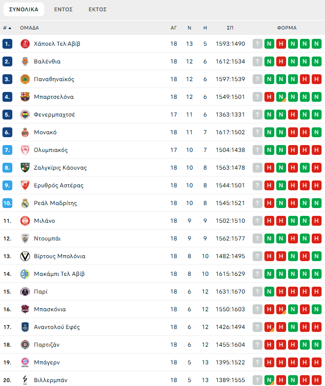 EuroLeague: Η βαθμολογία μετά το τέλος της 18ης αγωνιστικής