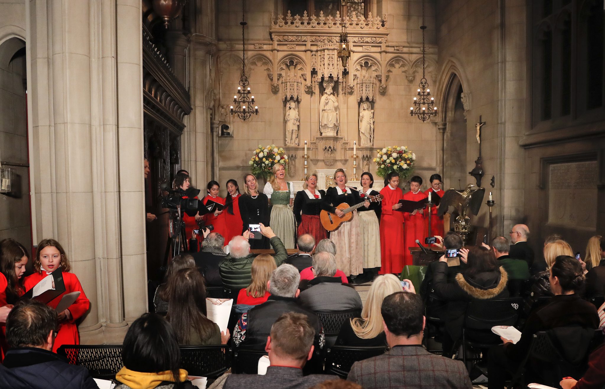 Η οικογένεια τραγουδιστών Κρέελ (Kroell Family Singers), στο κέντρο, ερμηνεύει το «Άγια Νύχτα», μαζί με χορωδία κατά τη διάρκεια εκδήλωσης στην Trinity Church, στη Νέα Υόρκη. Νοέμβριος 2018.(AP Photo/Julie Jacobson)
