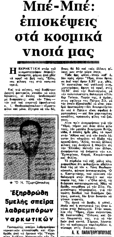 Η Μπριζίτ Μπαρντό, μία από τις μεγαλύτερες διεθνείς σταρ που σημάδεψαν τον 20ό αιώνα, επισκέφθηκε την Ελλάδα τον Αύγουστο του 1969, προκαλώντας φρενίτιδα θαυμασμού.