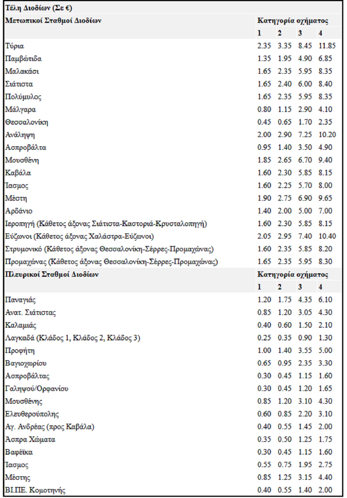Αναλυτικά, οι νέες τιμές ανά μετωπικό και πλευρικό σταθμό διοδίων διαμορφώνονται ως εξής: